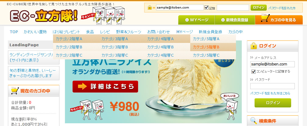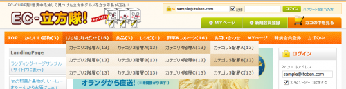 ITOBEN STYLE > EC-CUBE:No.017 ヘッダー部に商品カテゴリを表示するグローバルナビゲーション 2014年8月2日カテゴリー:未分類 EC-CUBE:No.017 ヘッダー部に商品カテゴリを表示するグローバルナビゲーション このカスタマイズを現行サイトへ実装したい方はこちら ▼サンプルをご覧ください http://www.kaiplus.com/part/213/ http://www.kaiplus.com/part/213_2/ http://www.kaiplus.com/part/213_3/ レイアウト設定で、グローバルナビのブロックを配置します。 登録されているカテゴリが表示されます。 カテゴリに商品が登録されていなければ、表示されません。 ▼ナビゲーションのデザイン・レイアウトはCSSで調整 7パターンのCSSを用意しています。 それぞれのCSSに修正を加えることで、デザイン・レイアウトをさらに変更することができます。 ファイル名をcategory_globalnav.cssに変更して、適用します。 (1)category_globalnav.cssを適当な名称に変更します。ここでは、category_globalnav-00aaa.css (2)適用したいCSSを選び、名称をcategory_globalnav.cssに変更します。 ここでは、category_globalnav-010.cssをcategory_globalnav.cssに変更しています。 (3)FTP等で、サーバのcategory_globalnav.cssに上書きアップロードしてください。 ▼各CSSを適用したときのデザイン・レイアウト category_globalnav-010.css ————————————————————- category_globalnav-011.css ————————————————————- category_globalnav-012.css ————————————————————- category_globalnav-013.css ————————————————————- category_globalnav-021.css ————————————————————- category_globalnav-022.css ————————————————————- category_globalnav-023.css ————————————————————- メインバー(1階層)の表示項目 data/Smarty/templates/default/frontparts/bloc/category_globalnav.tpl 商品カテゴリ以外の項目は、下記コードの、 以外の部分です。 [php] $smarty.const.TEMPLATE_REALDIRfrontparts/bloc/category_globalnav_tree_1.tpl" children=$arrTree treeID="" display=1}--> abouts/”>当サイトについて guide/privacy.php”>プライバシーポリシー entry/kiyaku.php”>新規会員登録 true:表示する, false:表示しない, 1:1階層のみに表示, 2:2階層以下に表示) ■true:表示する ■false:表示しない ■1:1階層のみに表示 ■2:2階層以下に表示 さらに詳しく→マニュアル 【ご利用の流れ】 1.空フォルダをダウンロードします。空フォルダは各カスタマイズごとに異なります。対象となる空フォルダをダウンロードしてください。その際、EC-CUBEのバージョンとデータベースの種類をお書き添えください。(EC-CUBE2.4系のカスタマイズは行っておりません) 2.現行サイトのファイルを空フォルダに入れた後、zip形式等で圧縮し下記送信先にお送りください。 3.こちらでカスタマイズを施し、ファイルと請求書を送信いたします。 4.お客様ご自身でデータベースの追加・ファイルのアップロードを行い、動作確認をしてください。 5.料金は後払いで結構です。動作に問題がなければ、指定の銀行に料金をお振り込みください。 ★カスタマイズによっては、データベースへの追加等が必要になる場合があります。 データベース追加用の命令文(SQL)はこちらで用意しますので、作業はお客様でお願いいたします。 カスタマイズのお申込みと空フォルダのダウンロードはこちらから